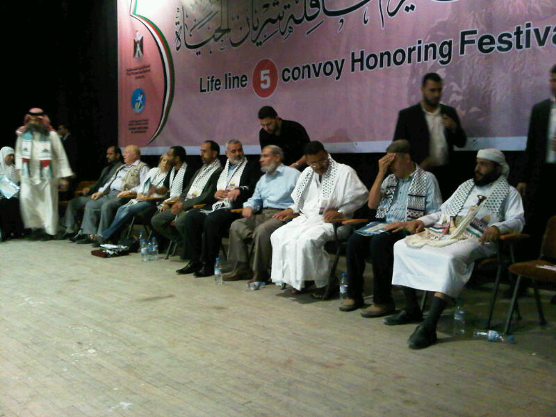 On Friday, Viva Palestina activists met with Hamas PM Ismail Haniyeh during a lunch. Haniyeh later appeared on stage at a festival honoring the "Life line 5 convoy," along with Yemini Sheikh Muhammad al-Hazimi. Al-Hazimi instigated passengers on the IHH Mavi Marmara ship to fight the Israelis during the May 2010 flotilla. Haniyeh is the man sitting fifth from the right, and Al-Hazimi is the man sitting all the way on the right in this picture.