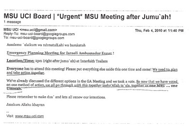 Those internal minutes and emails, first exposed by the Investigative Project on Terrorism last year, show that the students rejected more traditional forms of protest and made silencing the ambassador their goal. In addition, and this is something their allies ignore, the students agreed to lie about the role the Muslim Student Union played in orchestrating the plot.