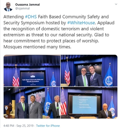 In September, the Department of Homeland Security (DHS) held its Faith Based Community Safety and Security Symposium at the White House. Oussama Jammal, secretary general of the Islamist U.S. Council of Muslim Organizations (USCMO) attended, along with representatives of the Muslim Public Affairs Council (MPAC). They were among 180 participants representing faith-based communities, the federal government, and state and local governments who participated. Vice President Mike Pence spoke at the event.