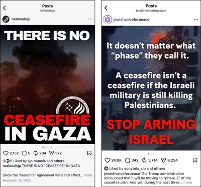 SJP and JVP have agreed since the October 10 ceasefire in Gaza was announced that there really is no ceasefire. While Hamas has violated the ceasefire terms since the beginning, SJP and JVP ignore those violations and remain fixated on Israeli retaliations.
