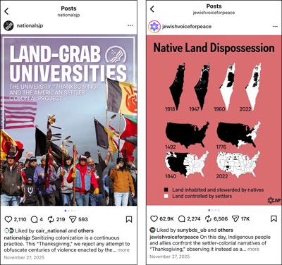For last year's November 27 Thanksgiving message, the JVP and SJP Instagram messages are nearly identical, right down to the scare quotes around "Thanksgiving."