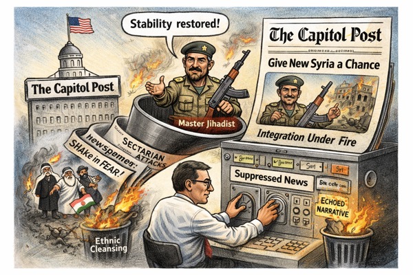 Reporting on the Kurds followed a similar pattern. The forced withdrawal of Kurdish forces was described as Damascus "reasserting control" or "restoring sovereignty," while the artillery strikes, drone attacks, militia terror, and mass displacement that preceded withdrawal were treated as secondary details. Autonomy did not "expire." It was destroyed. Yet the language of inevitability replaced the language of coercion.